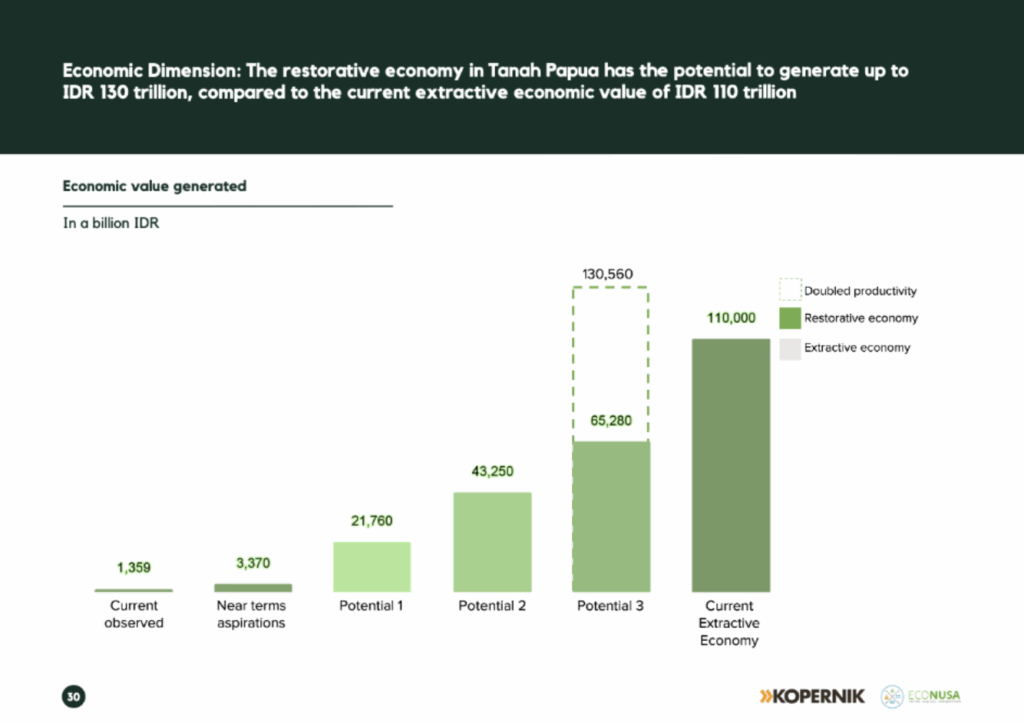 “With bold investment, Papua’s restorative economy can grow from pilot initiatives into a provincial economic driver potentially surpassing the extractive industries,” the Kopernik–EcoNusa report asserts.
