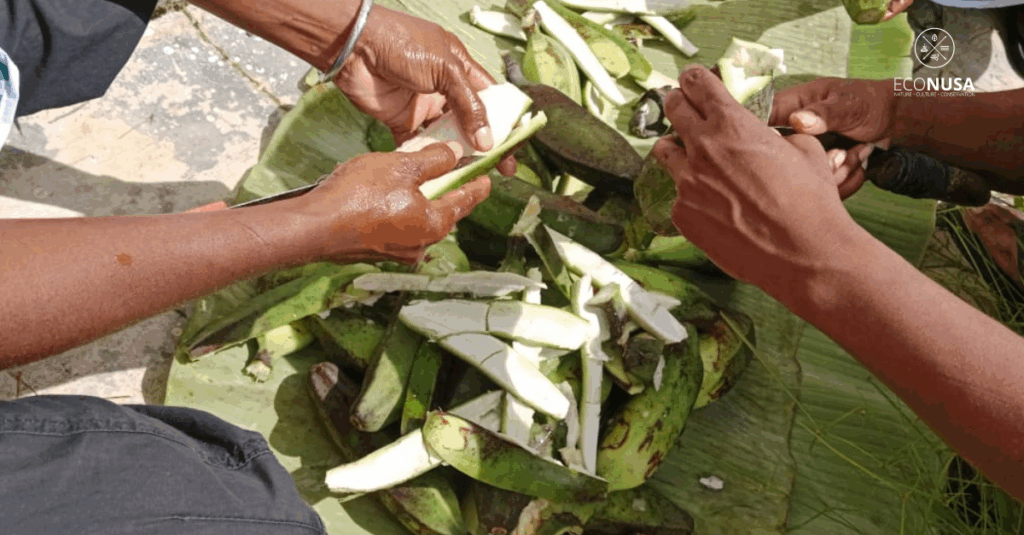 EcoNusa memberikan pelatihan pengolahan keripik pisang kepada masyarakat. Perempuan-perempuan Tehit Mlaqya, atau yang biasa dipanggil mama-mama Mlaqya, dengan semangat memperhatikan. Mereka kemudian mulai mengolah pisang menjadi keripik. Meski dengan alat seadanya yaitu pisau tajam, wajan besar, dan kompor sederhana, mereka memotong tipis pisang, menggorengnya hingga keemasan, lalu menaburkan sedikit garam. Rasanya gurih dan renyah.